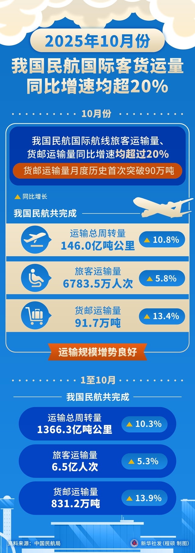 2025年10月份我国民航国际客货运量同比增速均超20%